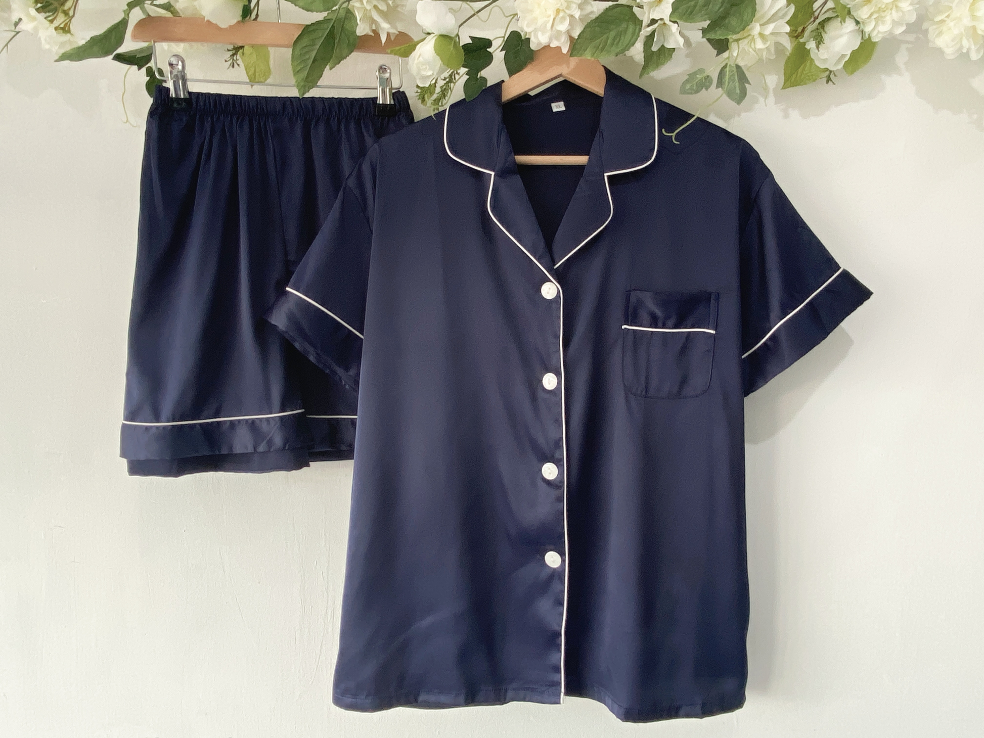 Made from soft polyester satin with chic piping, cute buttons, and a comfy elastic waistband, these pyjamas blend style and coziness, flattering every shape.
